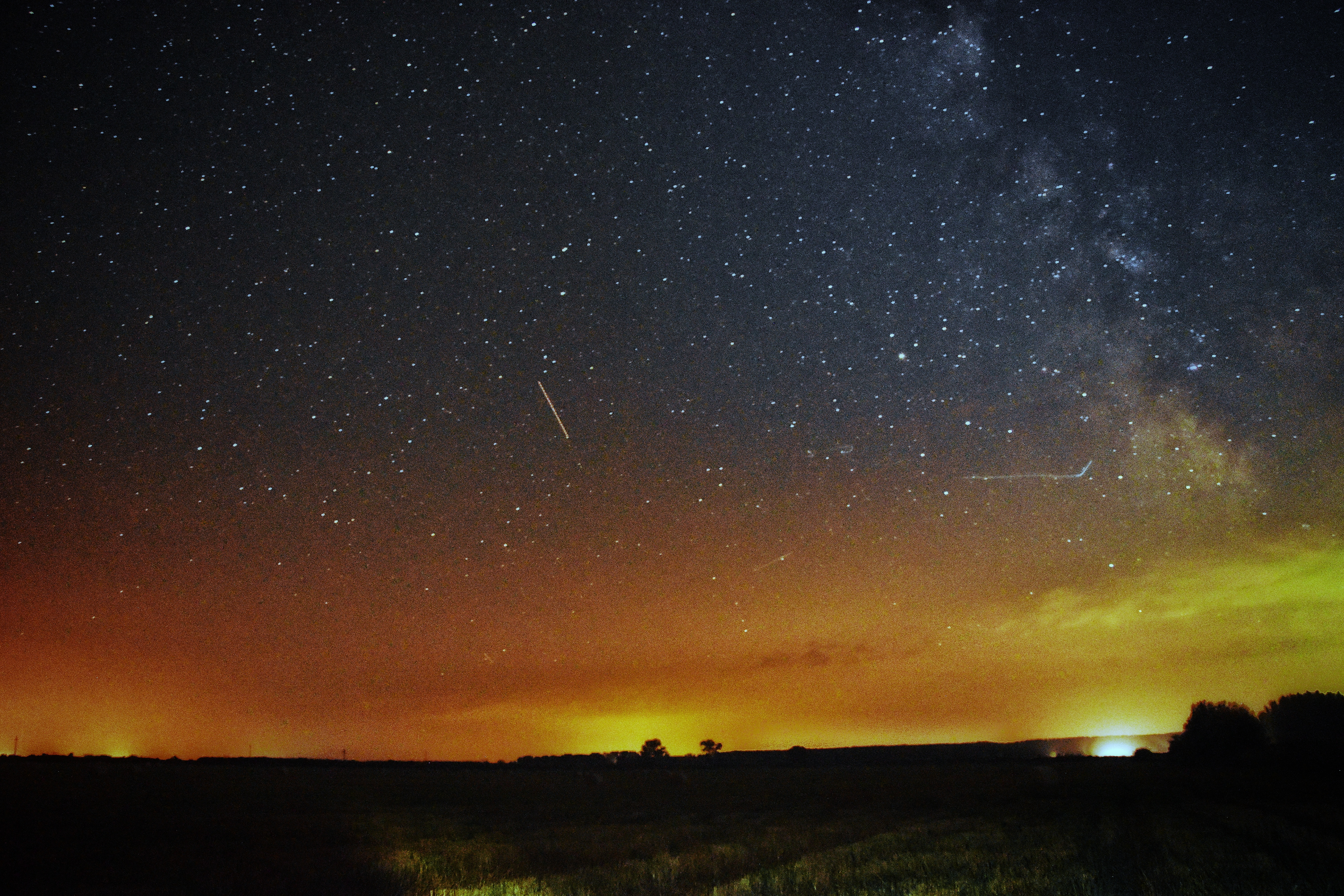 Dramatična noćna fotografija snimljena u Severnom Banatu, koja prikazuje veličanstvenost Mlečnog puta iznad vojvođanske ravnice. Jasno definisan zvezdani pojas se proteže preko duboko plavog neba, dok se na dnu kadra vidi narandžasti sjaj udaljenog naselja i siluete drveća, stvarajući snažan kontrast između neba i zemlje