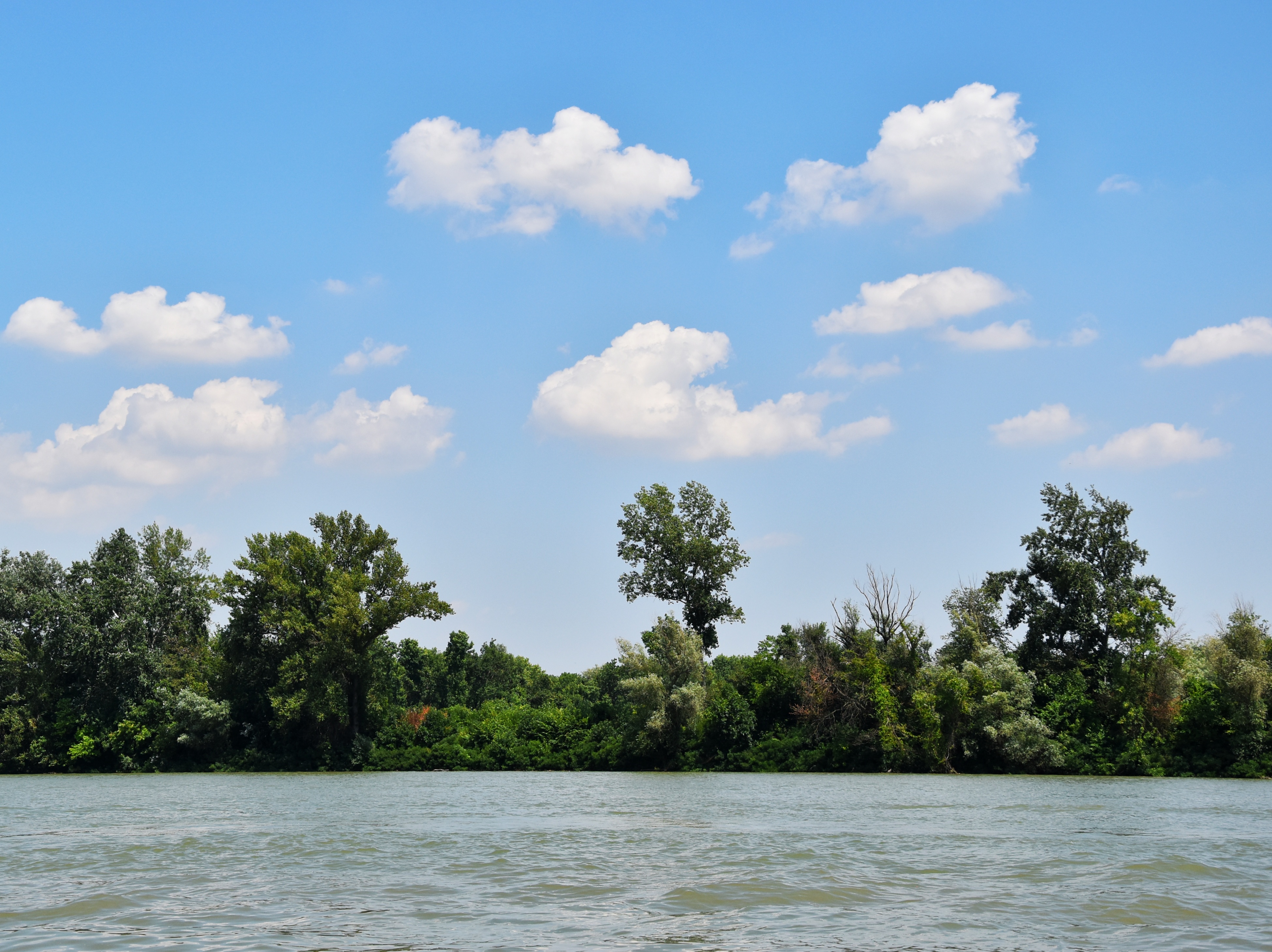 Fotografija prikazuje spokojni pejzaž reke Tise. Gusta obalna vegetacija i kristalno plavo nebo sa belim kumulusima stvaraju idiličnu atmosferu. Tisa je simbol severne Vojvodine i jedan od najvažnijih prirodnih koridora regije, poznata po svojoj sporoj vodi i bogatom biodiverzitetu