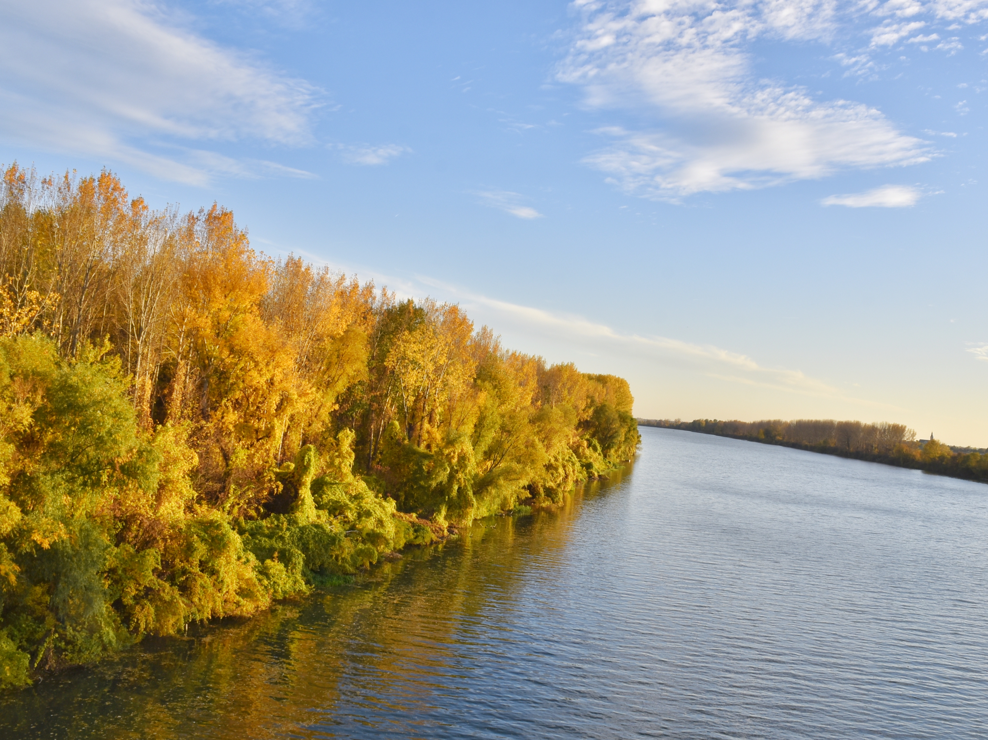 Fotografija prikazuje široki tok reke Tise tokom jeseni. Gusta obalna vegetacija je u jarkim nijansama žute i narandžaste boje, koje se blago reflektuju u mirnoj rečnoj vodi pod svetlo plavim nebom