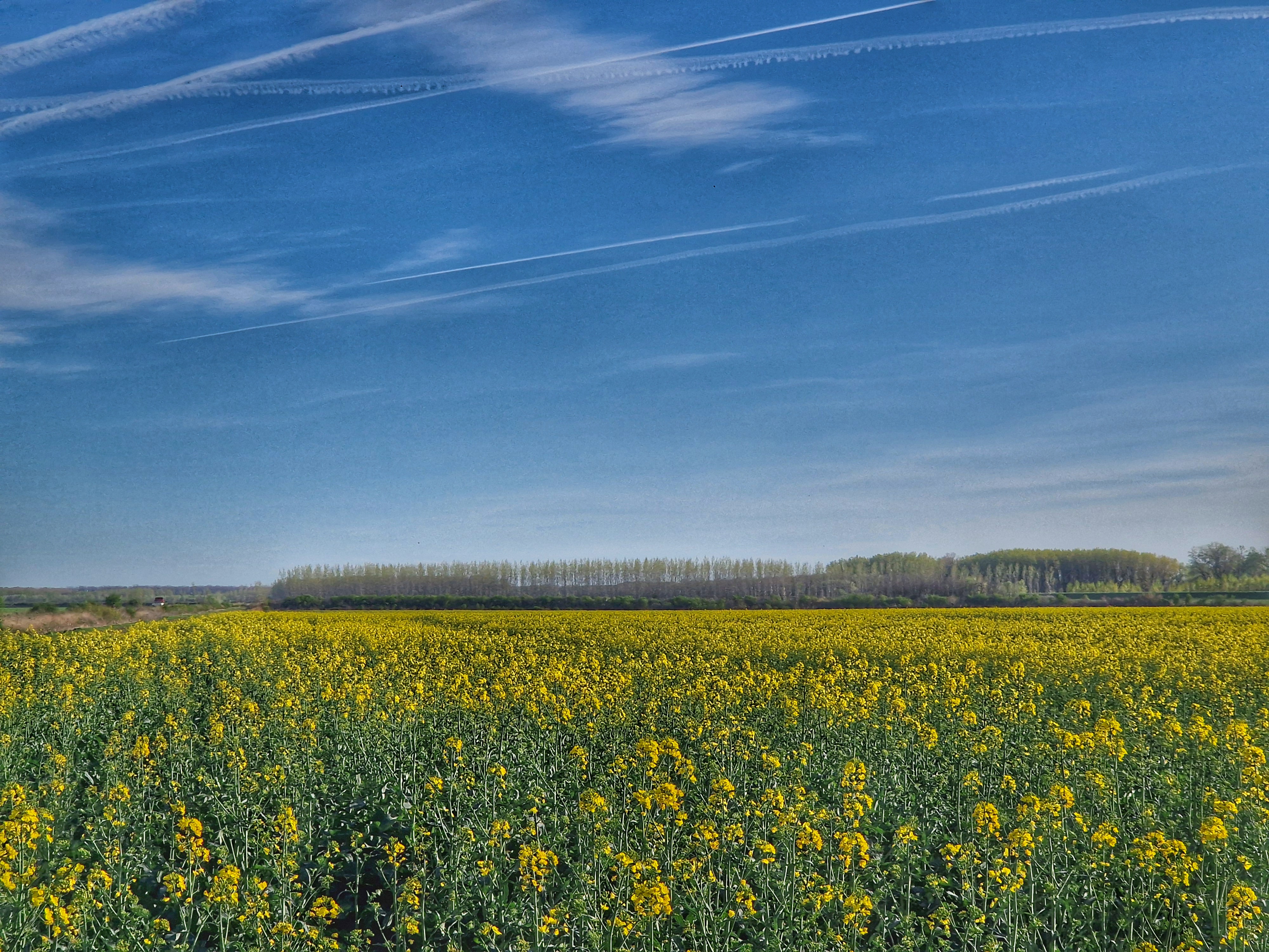 Fotografija prikazuje upečatljiv prolećni pejzaž Severne Bačke. Dominantno polje rascvetale uljane repice stvara snažan žuti tepih koji se proteže do horizonta. Dinamiku kadru daju brojni kondenzacioni tragovi aviona koji presecaju duboko plavetnilo neba, simbolizujući spoj netaknute prirode i modernog doba u vojvođanskoj ravnici