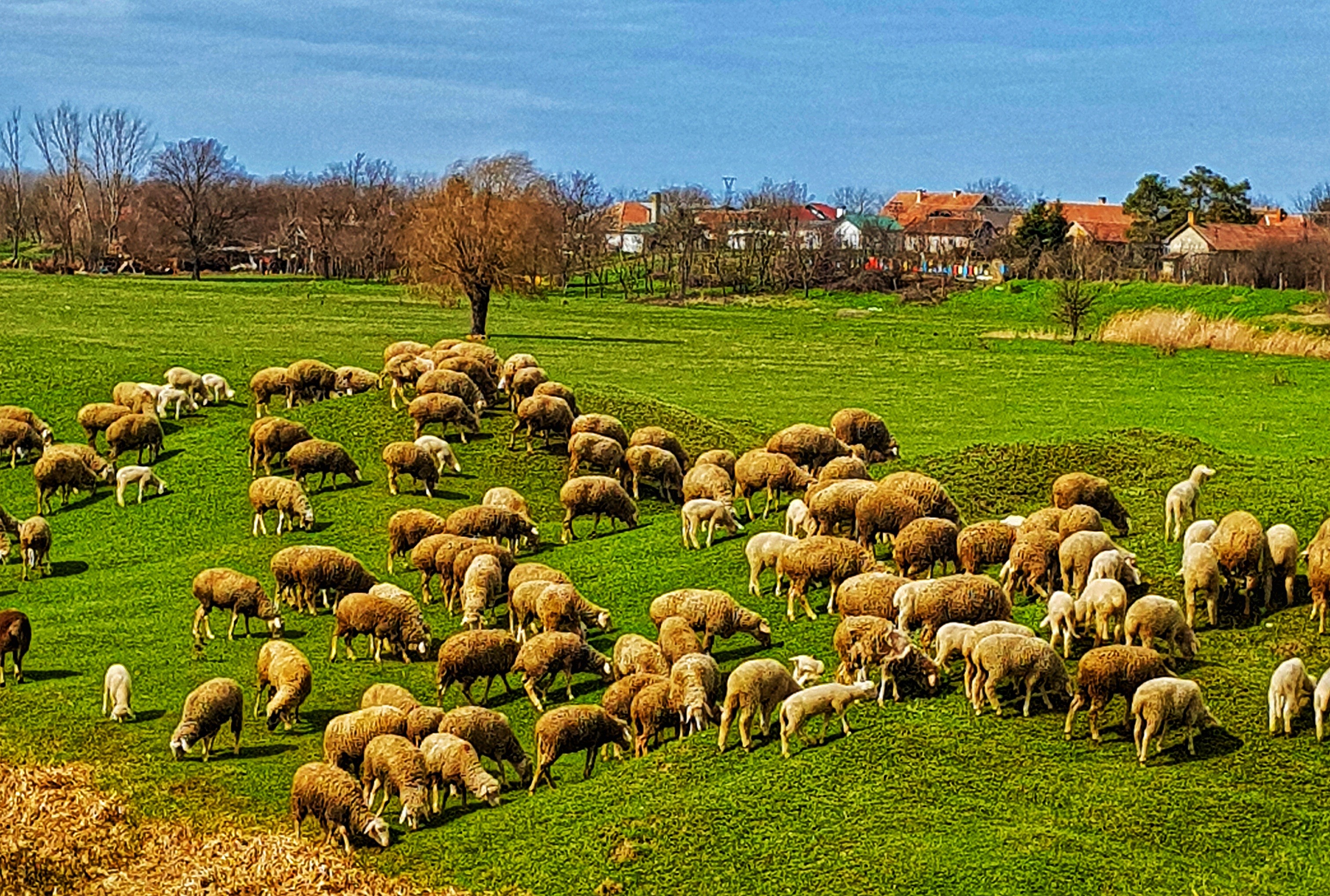 Fotografija prikazuje autentičan seoski prizor iz Severnog Banata. U fokusu je veliko stado ovaca na bujnom zelenom pašnjaku, što simbolizuje tradicionalni način života i prirodno bogatstvo vojvođanskih sela. Kadar odiše spokojem i podseća na važnost očuvanja prirode i starih zanata u ravnici