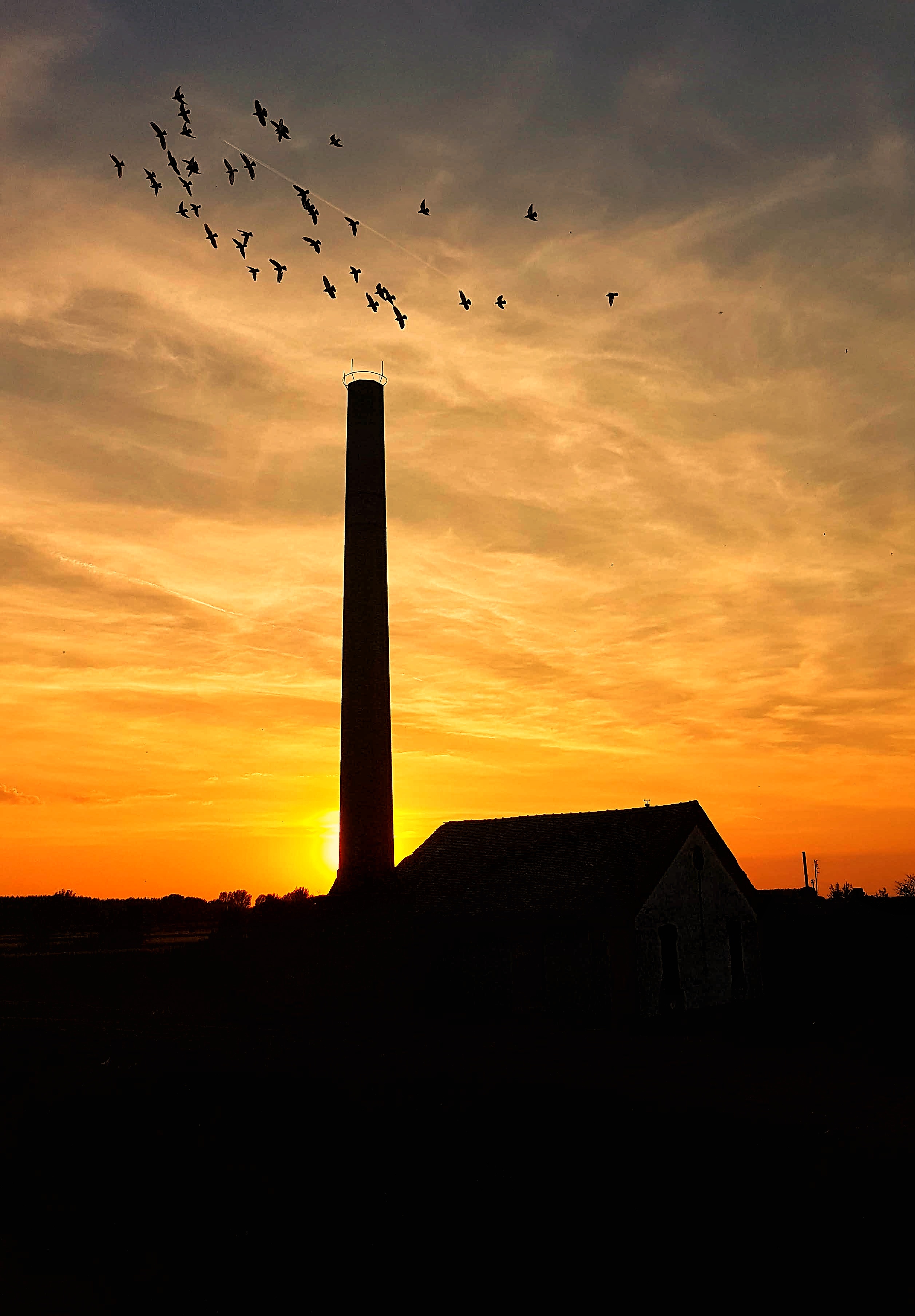 Umetnička fotografija siluete stare crpne stanice u Severnom Banatu tokom zalaska sunca. Visoki dimnjak i krov stanice ocrtavaju se naspram intenzivno narandžastog i žutog neba, dok jato ptica u letu dodaje dinamiku mirnom pejzažu. Ovaj objekat iz doba Marije Terezije simbolizuje dugovečnost inženjerskih poduhvata u službi ukrotivanja vojvođanskih voda