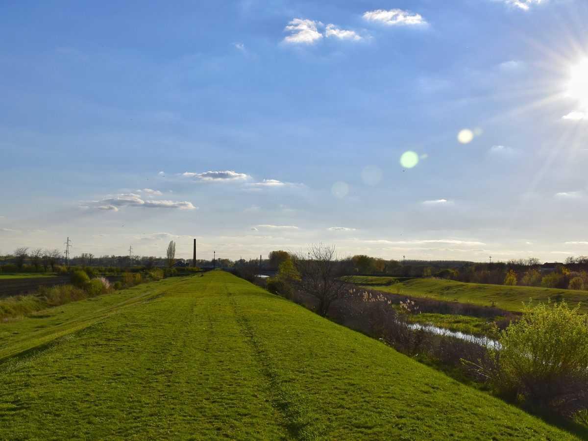 Siroki kadar zelenog nasipa koji se proteze duz reke Zlatice. Na desnoj strani se vidi deo recnog toka, dok je nebo prosarano belim oblacima sa izrazenim odsjajem sunca i blagim lens flare efektom