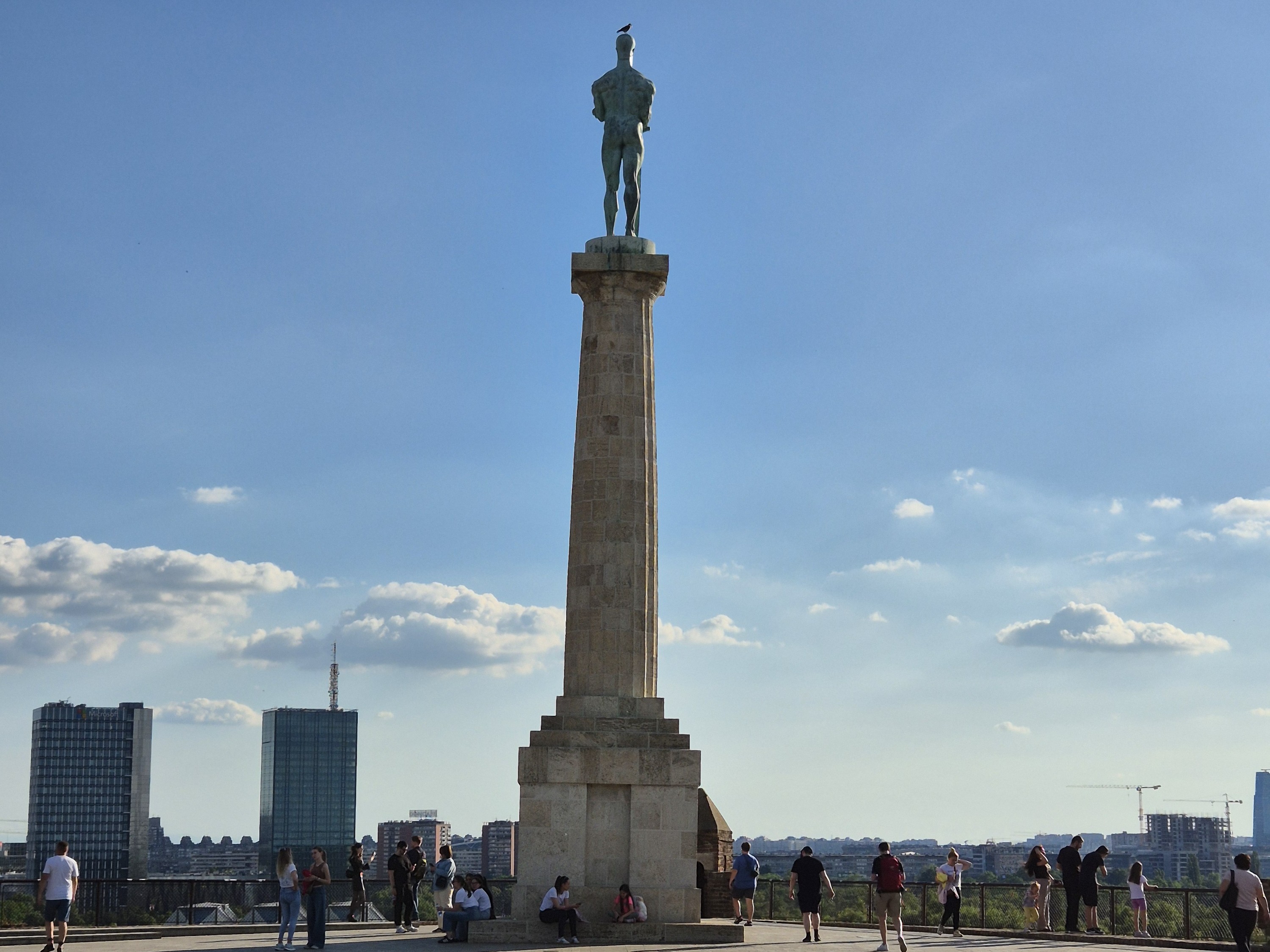 Kadar prikazuje legendarni Mestrovicev spomenik Pobednik na Kalemegdanu. U donjem delu slike vide se turisti i setaci na platou, dok se u pozadini naziru obrisi modernog Beograda pod svetlim popodnevnim nebom