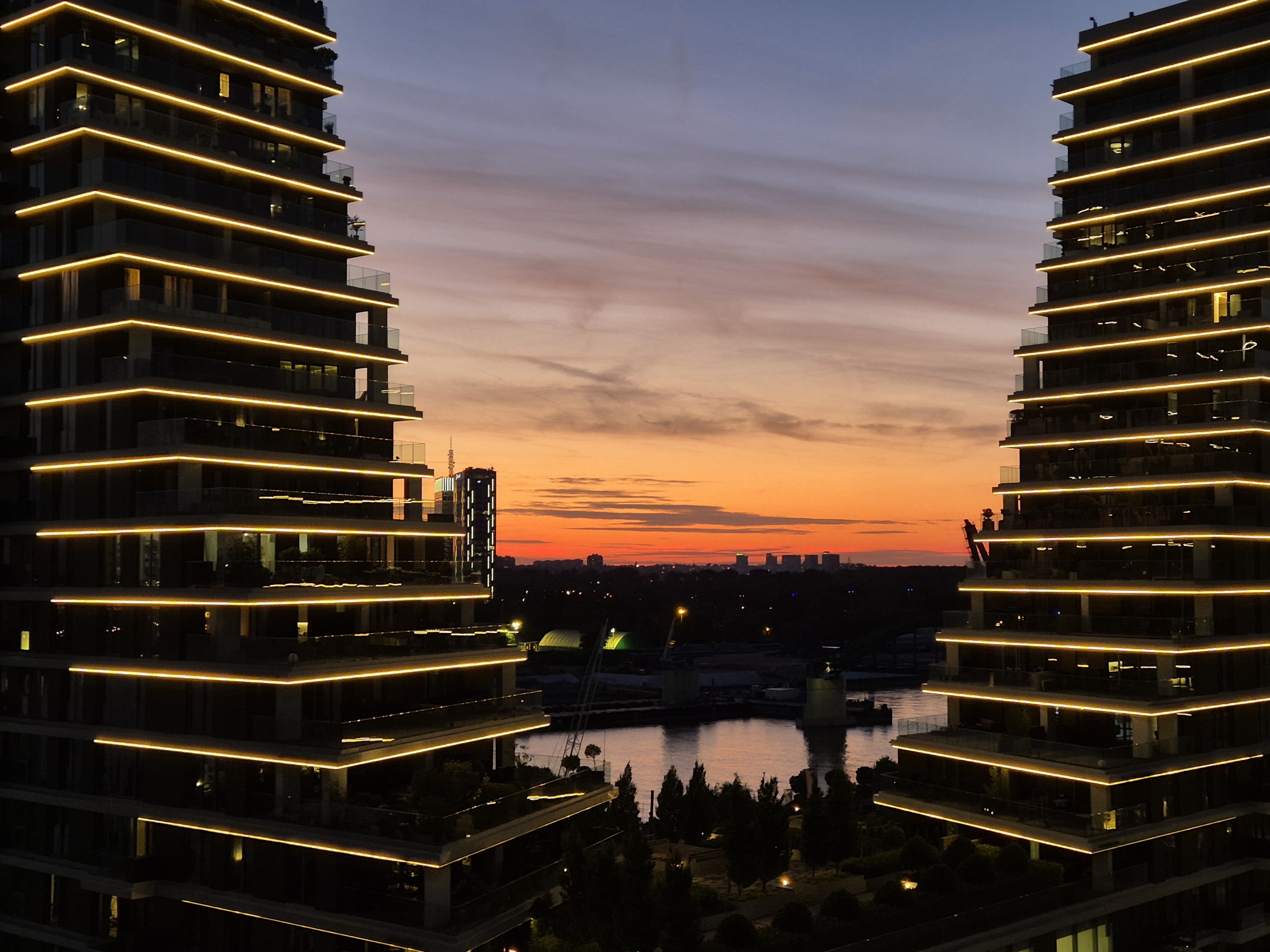 Nocni kadar koji prikazuje osvetljene terase luksuznih solitera u naselju Beograd na vodi. Izmedju zgrada se vidi dramatican zalazak sunca iznad Save, sto naglasava ubrzani razvoj i urbanu transformaciju glavnog grada.