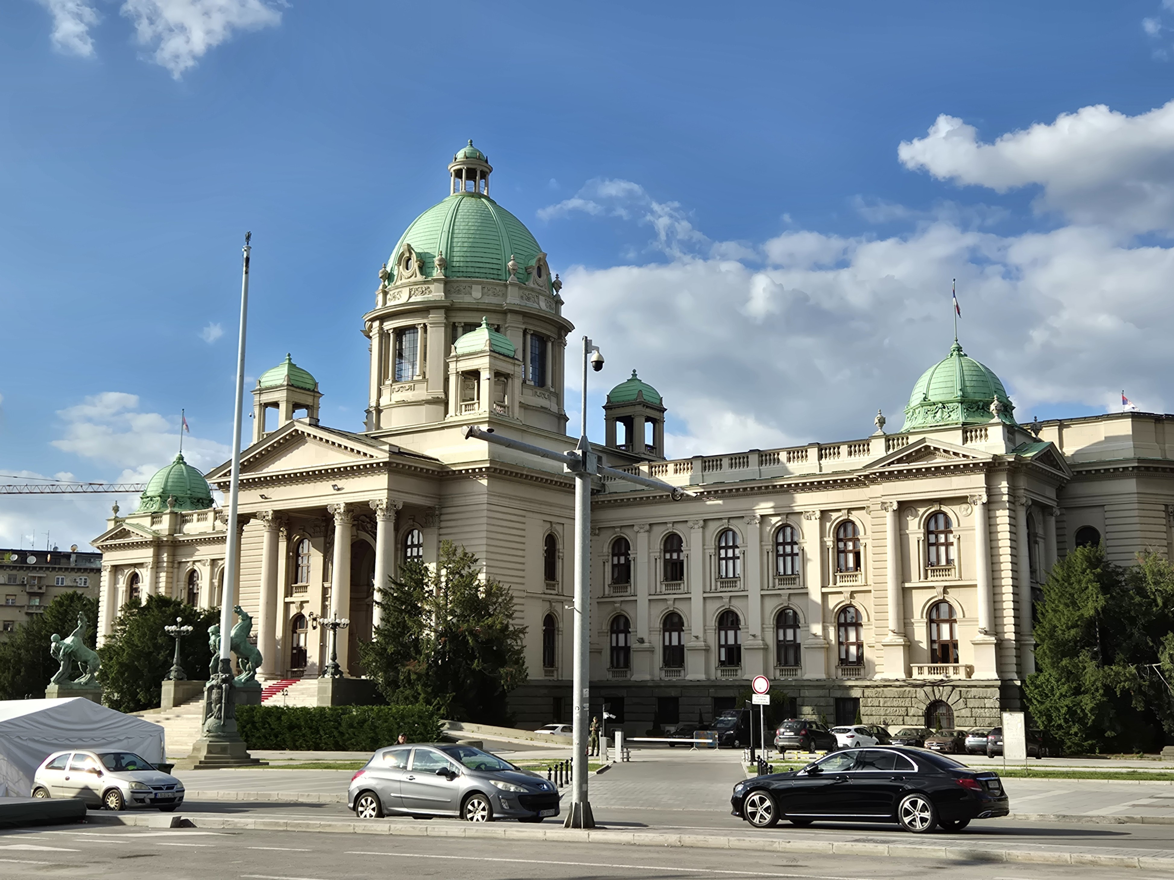 Dnevni snimak monumentalnog zdanja Narodne skupstine u centru Beograda. Fotografija istice neoklasicisticku fasadu, cuvene skulpture Igrali se konji vrani i dinamiku saobracaja ispred same institucije