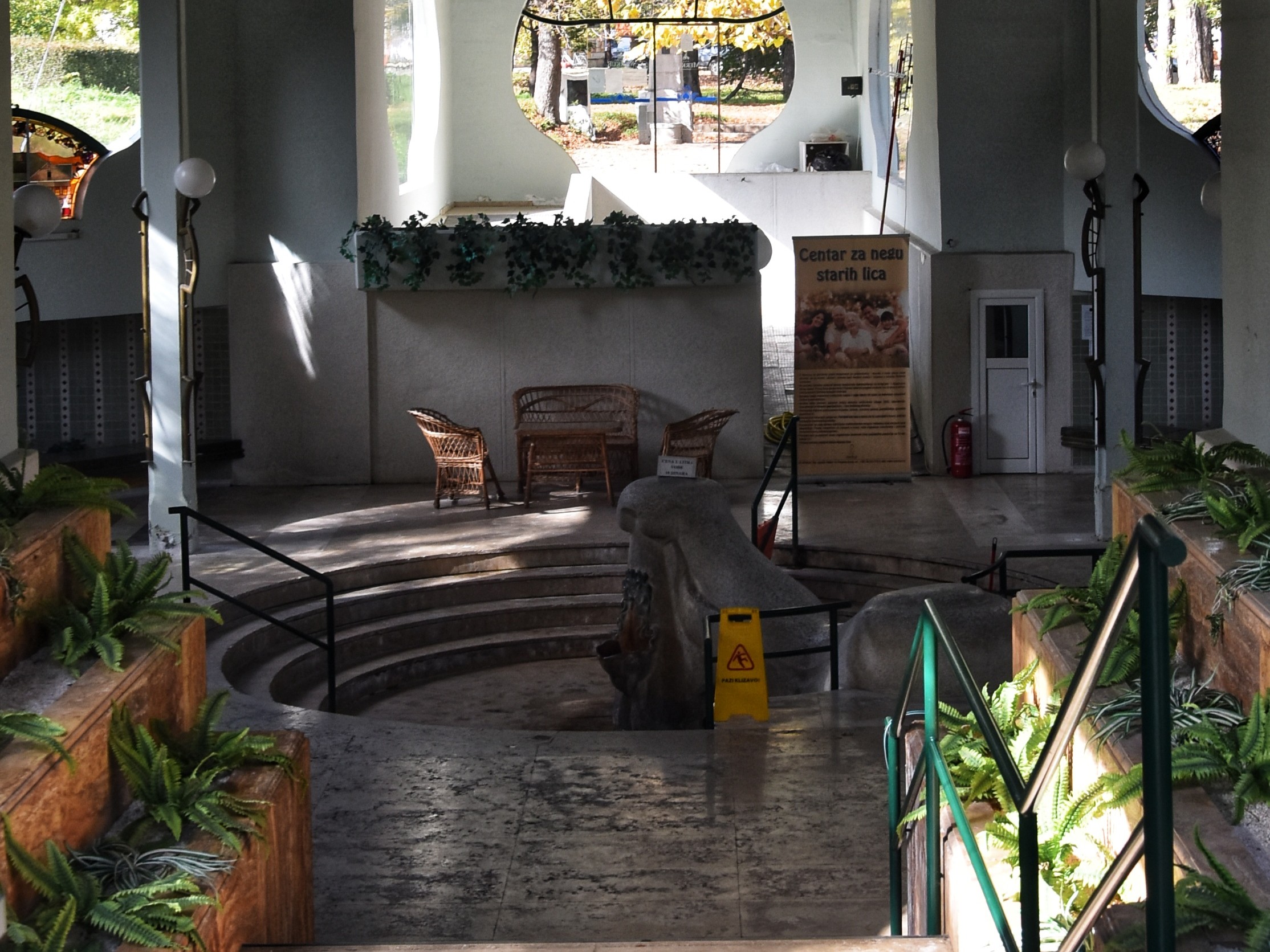 Fotografija prikazuje unutrasnji prostor paviljona izvora Slatina u Vrnjackoj Banji. Arhitektura sa kruznim otvorima, pletene stolice i stepenice koje vode ka samom izvoru stvaraju atmosferu klasicnog banjskog lecilista