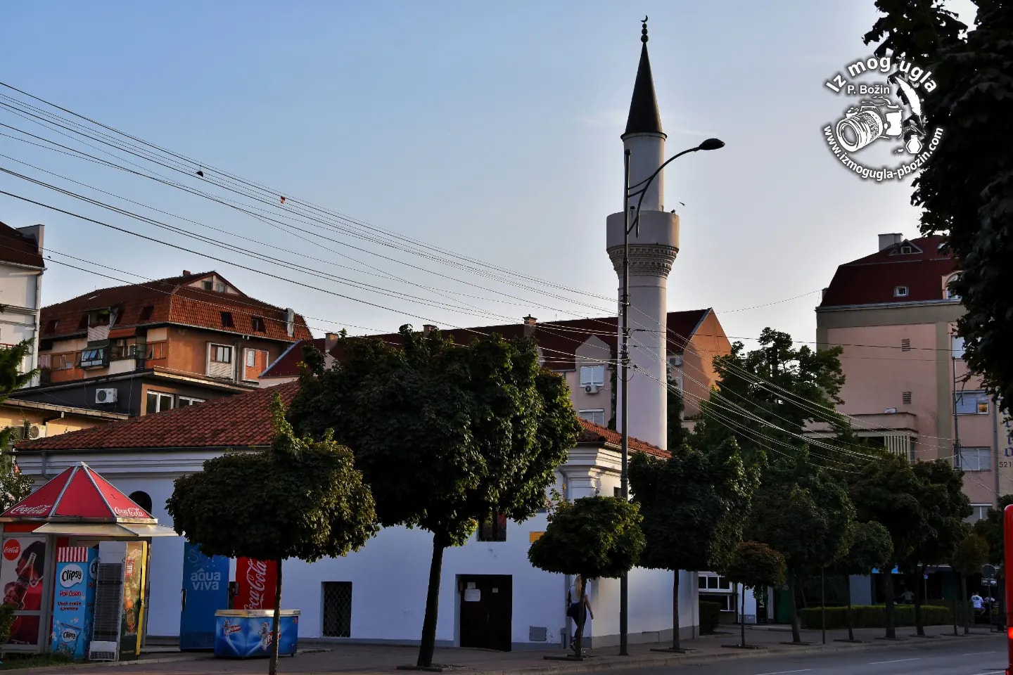 Kadar prikazuje autenticnu arhitekturu Islam-agine dzamije u Nisu. U prvom planu je visoki beli minaret, dok okruzenje gradskog jezgra i vecernje svetlo naglasavaju spoj razlicitih kulturnih i religijskih uticaja kroz istoriju grada
