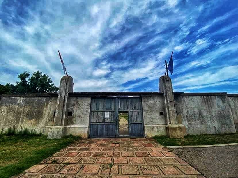 Kadar prikazuje autenticnu drvenu kapiju i visoke betonske zidove nekadasnjeg koncentracionog logora Crveni krst. Fotografija sa naglasenim kontrastom i dramaticnim nebom docarava tezinu i vaznost ovog istorijskog lokaliteta