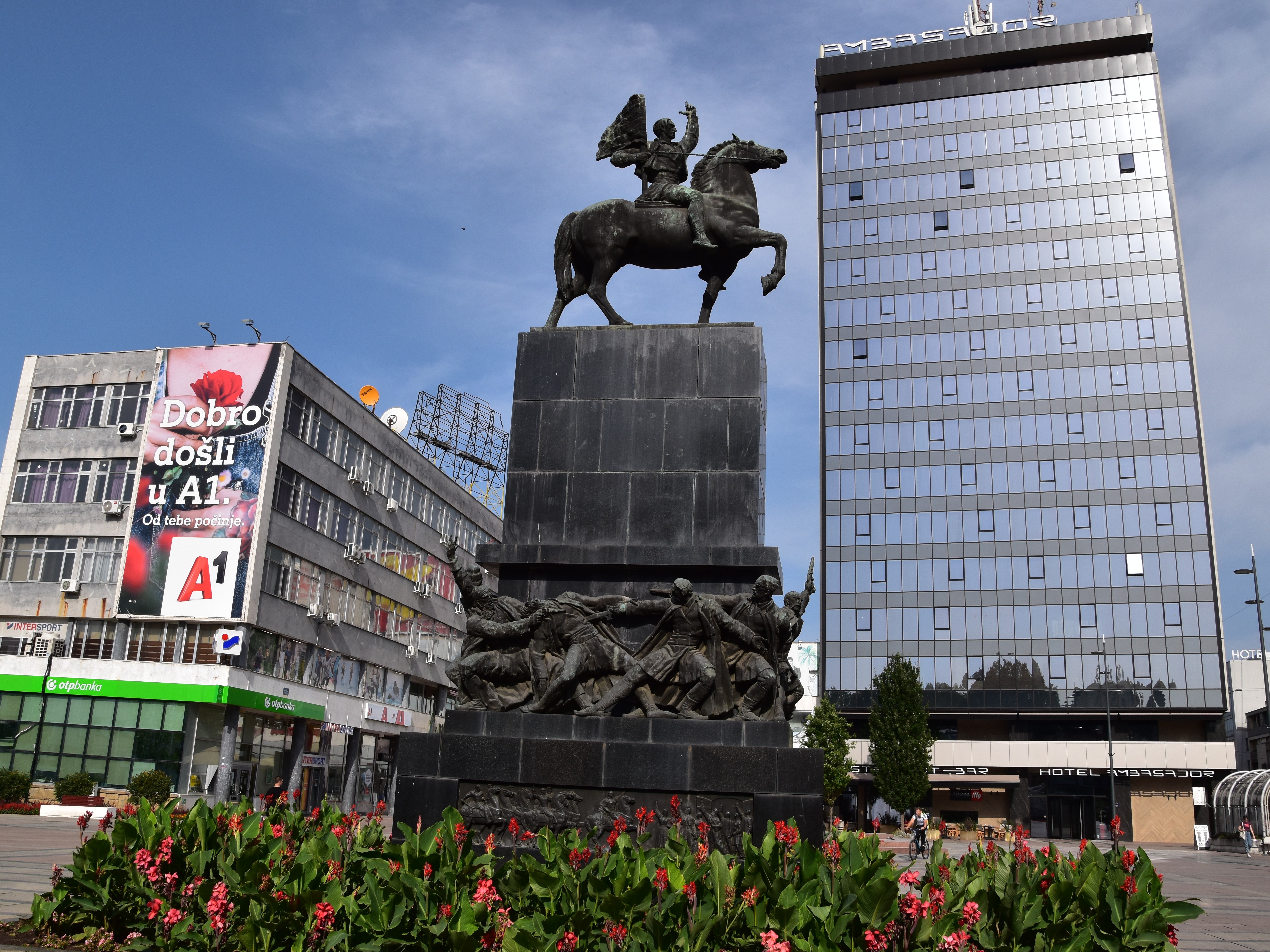 Kadar prikazuje centralni gradski trg u Nisu sa spomenikom Oslobodiocima Nisa u prvom planu. U pozadini dominira moderna arhitektura hotela Ambasador, dok cvetne aleje u podnozju spomenika dodaju boju urbanom pejzazu