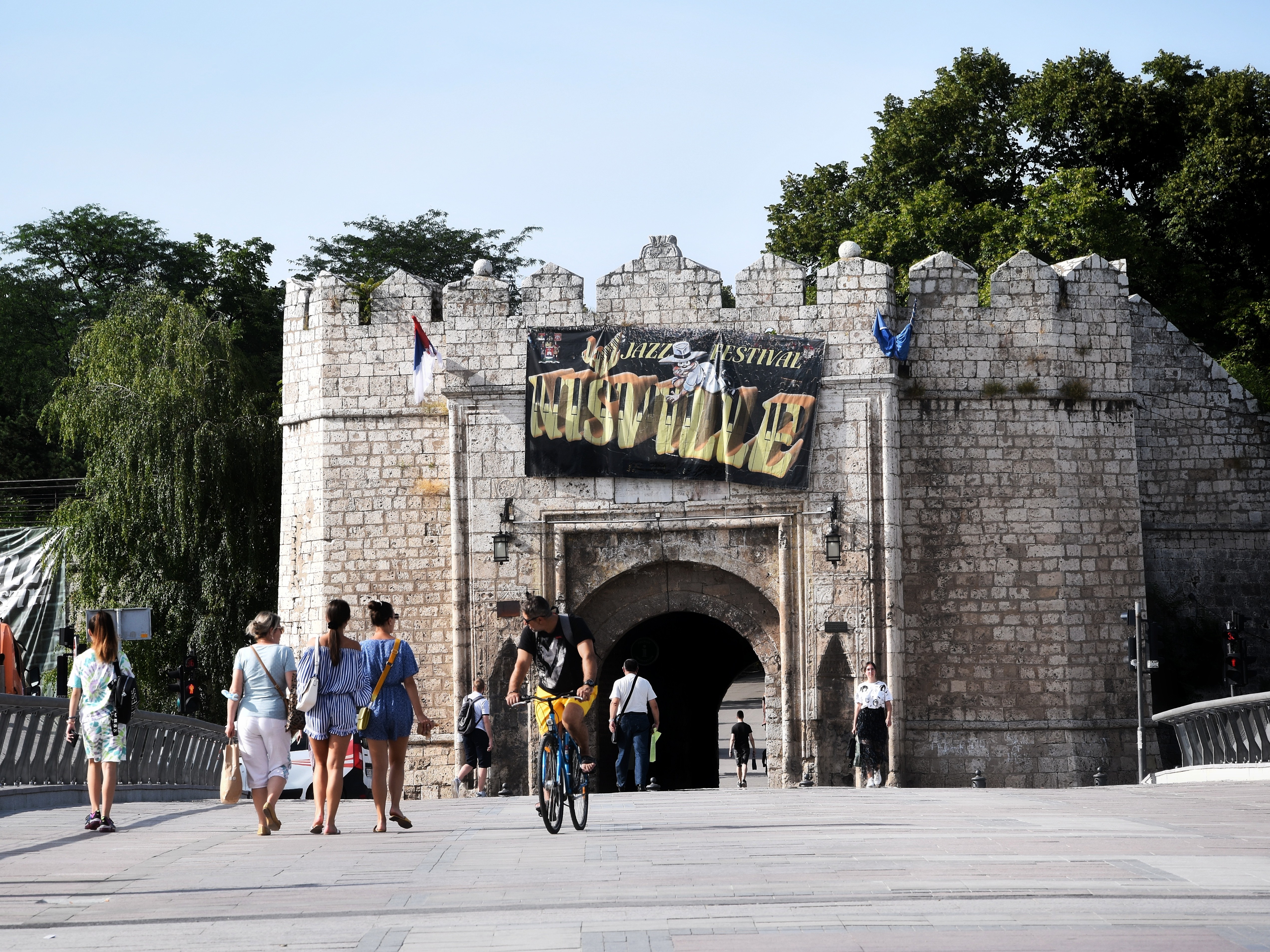 Kadar prikazuje monumentalni kameni ulaz u Nisku tvrdjavu. Na zidinama se vidi reklama za jazz festival Nisville, dok pesaci i biciklista na mostu preko Nisave docaravaju svakodnevnu energiju carskog grada