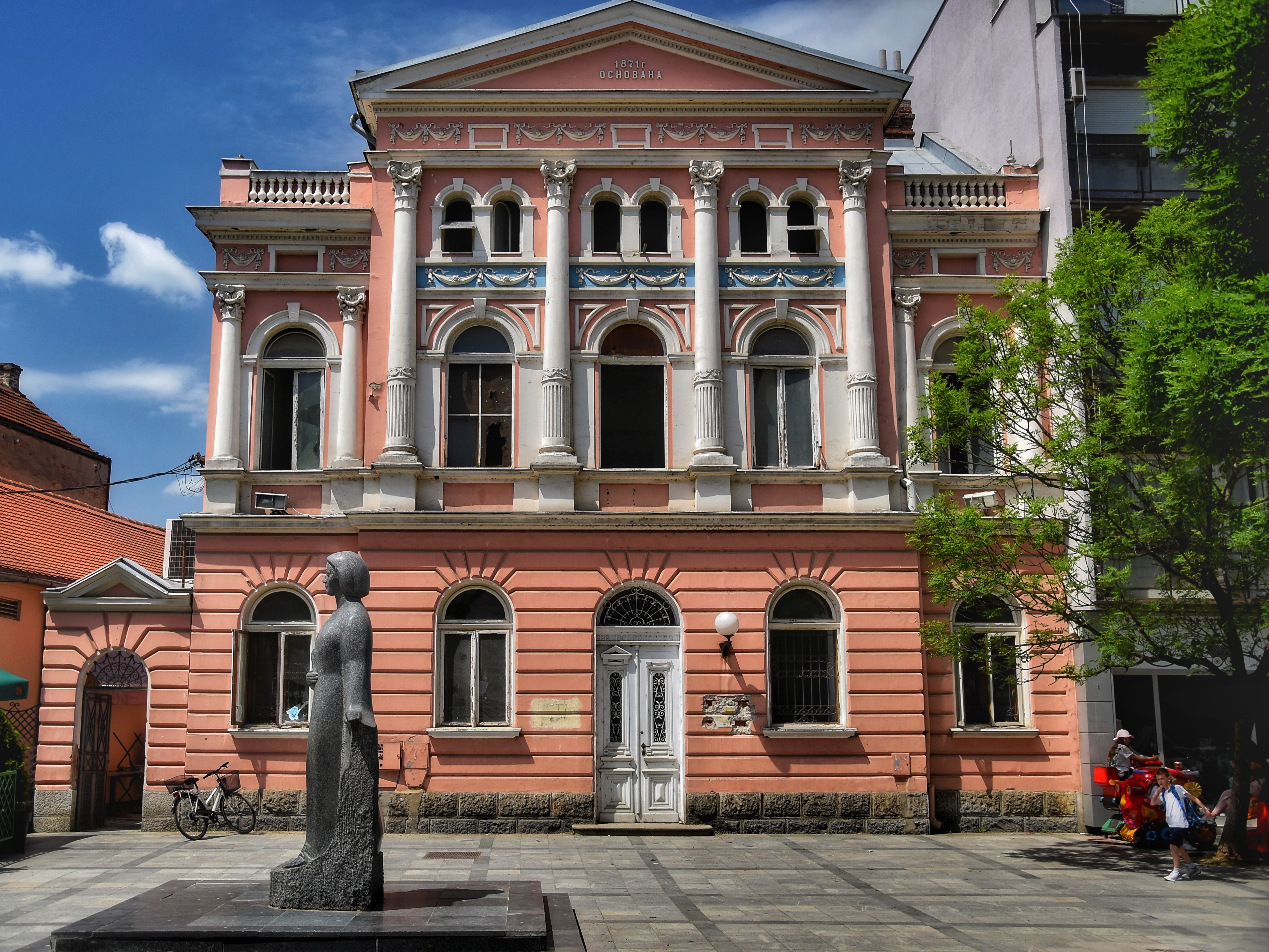 Kadar prikazuje monumentalnu zgradu bivše Valjevske stedionice gradjenu u stilu akademizma. Ispred ruzicaste fasade sa bogatom dekoracijom nalazi se spomenik cuvenoj pesnikinji Desanki Maksimovic pod vedrim letnjim nebom