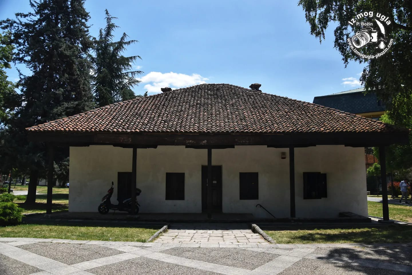 Frontalni prikaz Muselimovog konaka u Valjevu. Fotografija prikazuje autenticnu balkansku arhitekturu iz turskog perioda, belu fasadu i trem sa drvenim stubovima, okruzen parkovskim zelenilom