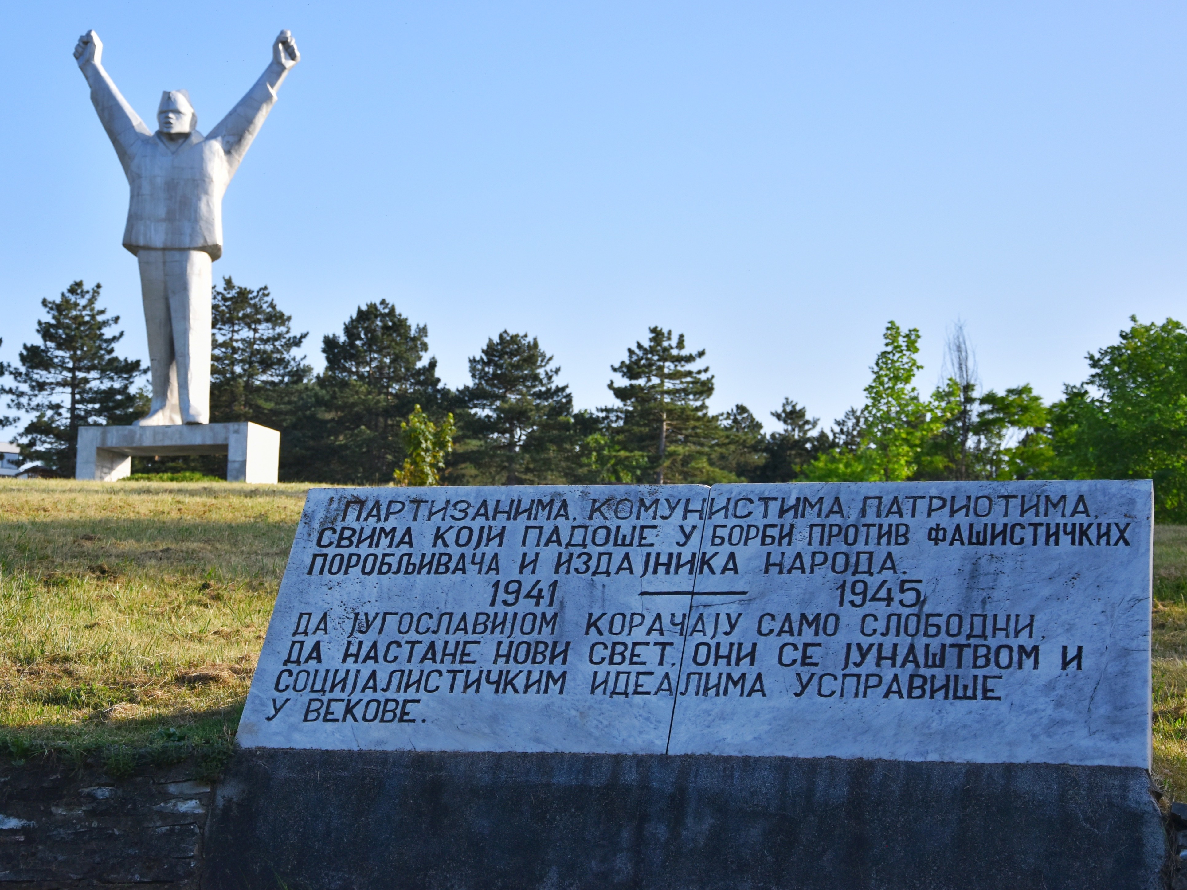 Kadar prikazuje grandioznu skulpturu narodnog heroja Stevana Filipovica u trenutku cuvenog prkosa, uz mermernu spomen-plocu posvecenu partizanima i patriotama. Fotografija istice kontrast belog mermera i zelenila na brdu Vidrak iznad Valjeva