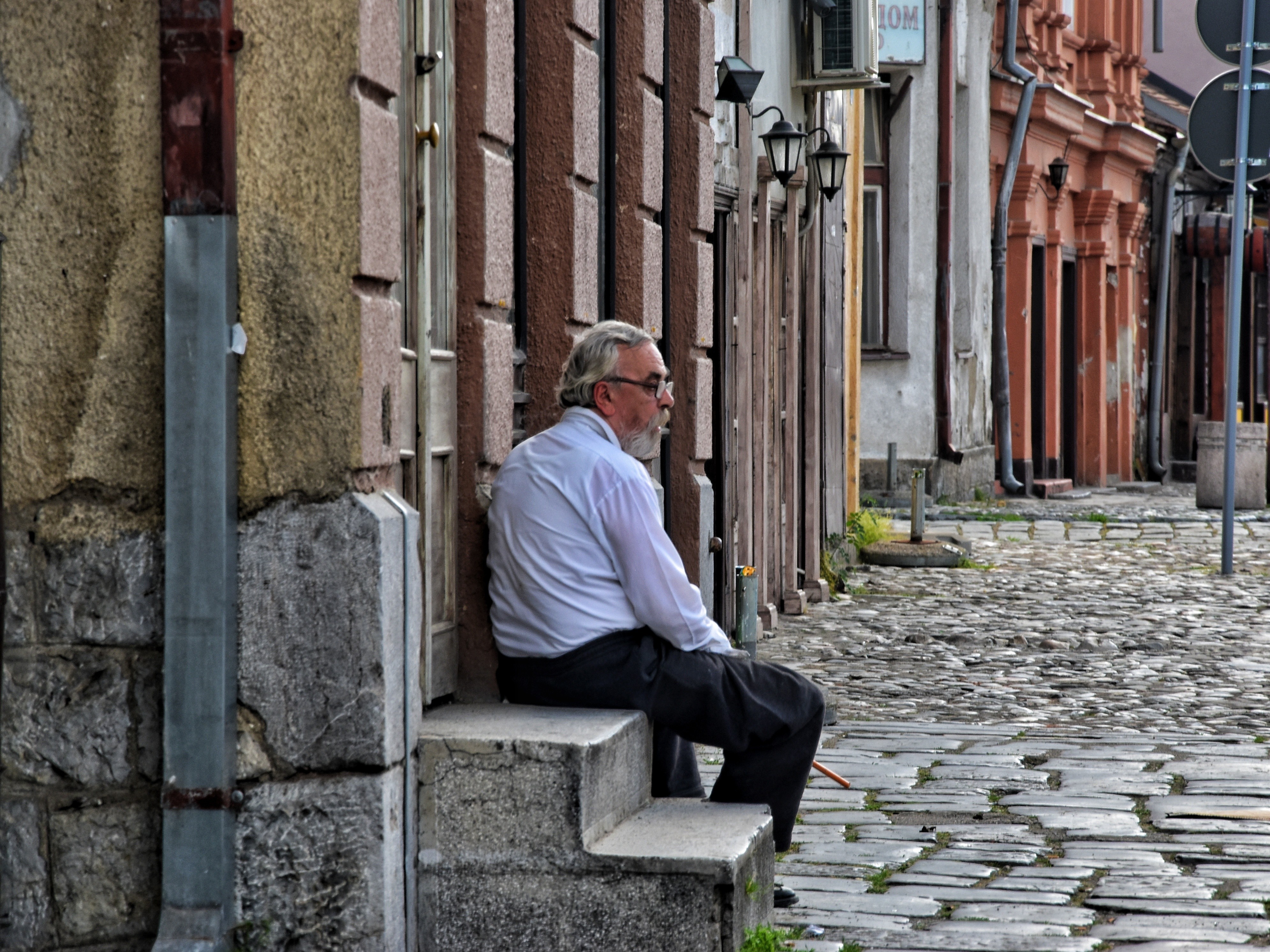 Emotivan kadar koji belezi portret starijeg coveka u beloj kosulji kako odmara na pragu starog zdanja. U pozadini se vidi autenticna turska kaldrma i arhitektura Tesnjara, sto docarava miran i tradicionalan zivot u Valjevu