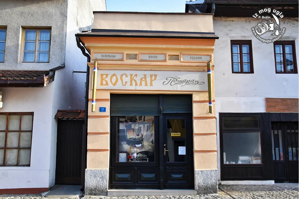 Frontalni prikaz stare zanatske radnje osnovane 1909. godine u valjevskoj carsiji Tesnjar. Fotografija belezi detalje predratne arhitekture, drveni izlog i specifican natpis koji evocira uspomene na staro Valjevo
