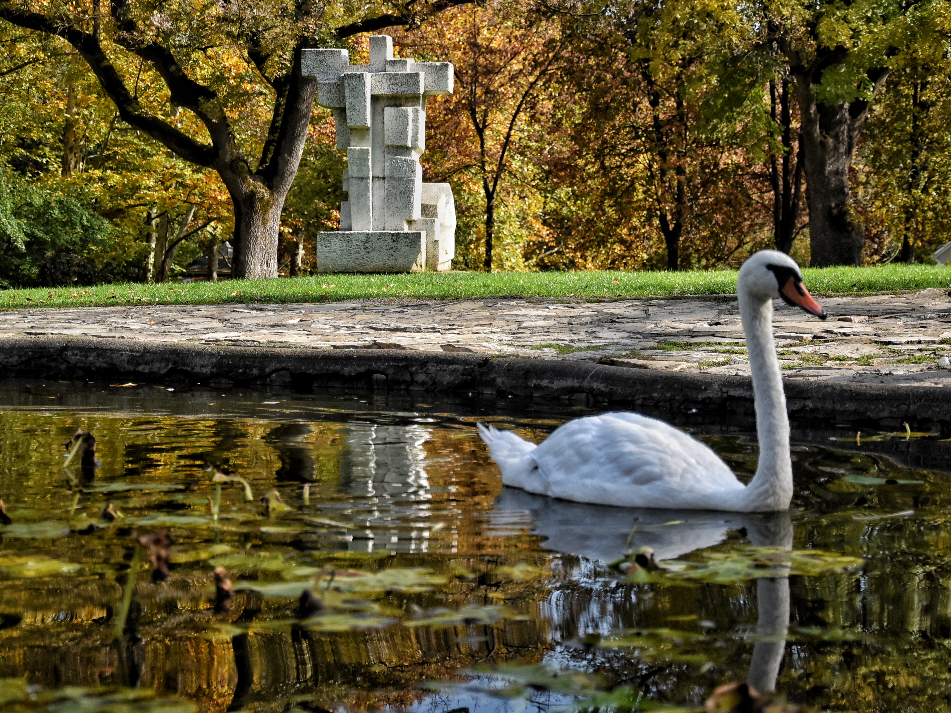 Kadar belezi belog labuda na povrsini jezera u Vrnjackoj Banji. U pozadini se vidi moderna kamena skulptura i bogato jesenje lisce, sto naglasava nostalgicnu i mirnu atmosferu banjskog lecilista